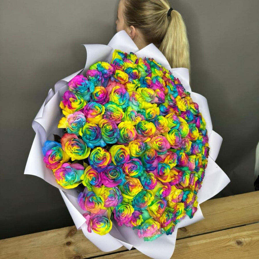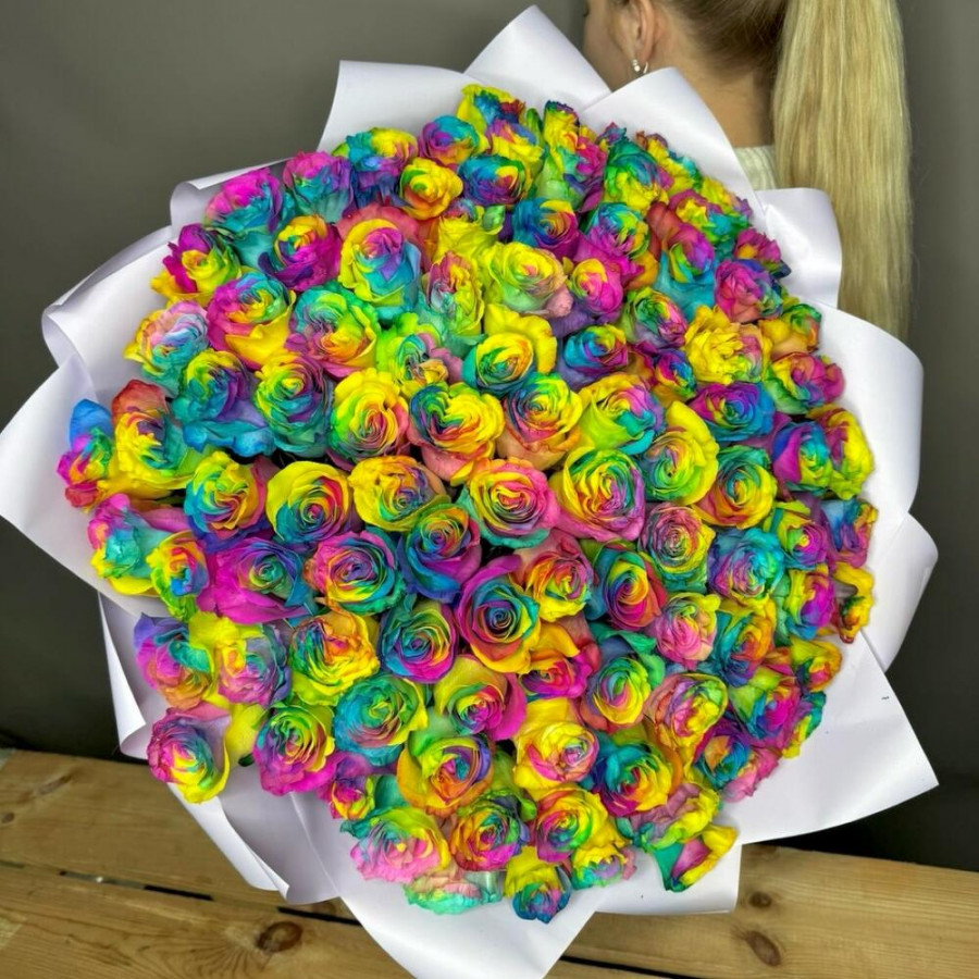 На фото букет из 101 радужной розы. В составе: роза 101 шт, дизайнерская упаковка 3 шт, атласная лента 3 шт, . Все цветы свежие и ароматные, букет красиво оформлен и отлично подходит для подарка. Доступна доставка цветов или самовывоз.