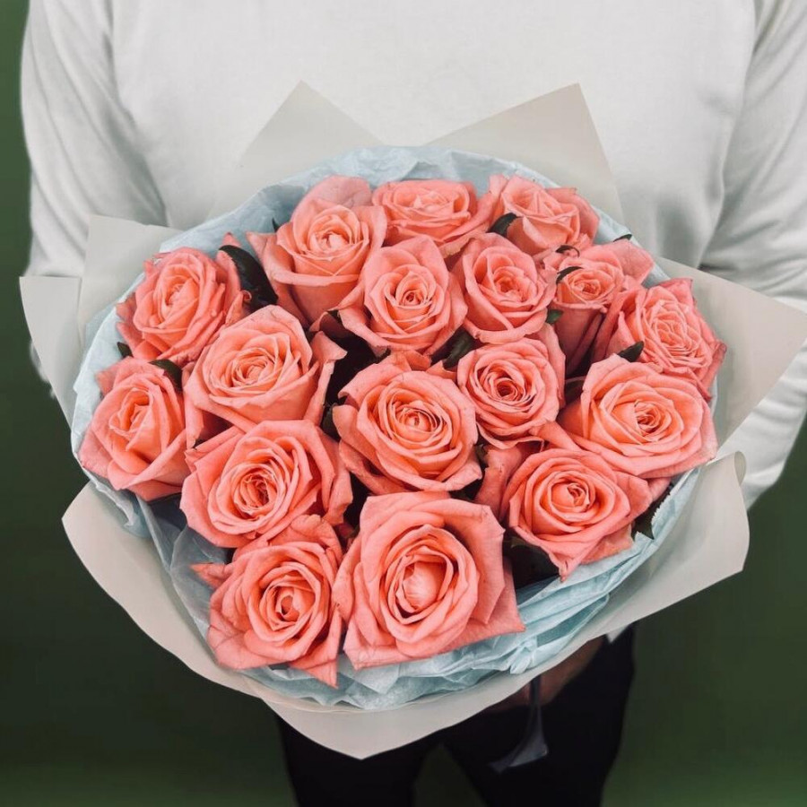 На фото букет из 17 коралловых роз. В составе: роза 17 шт, дизайнерская упаковка 2 шт, атласная лента 1 шт, . Все цветы свежие и ароматные, букет красиво оформлен и отлично подходит для подарка. Доступна доставка цветов или самовывоз.