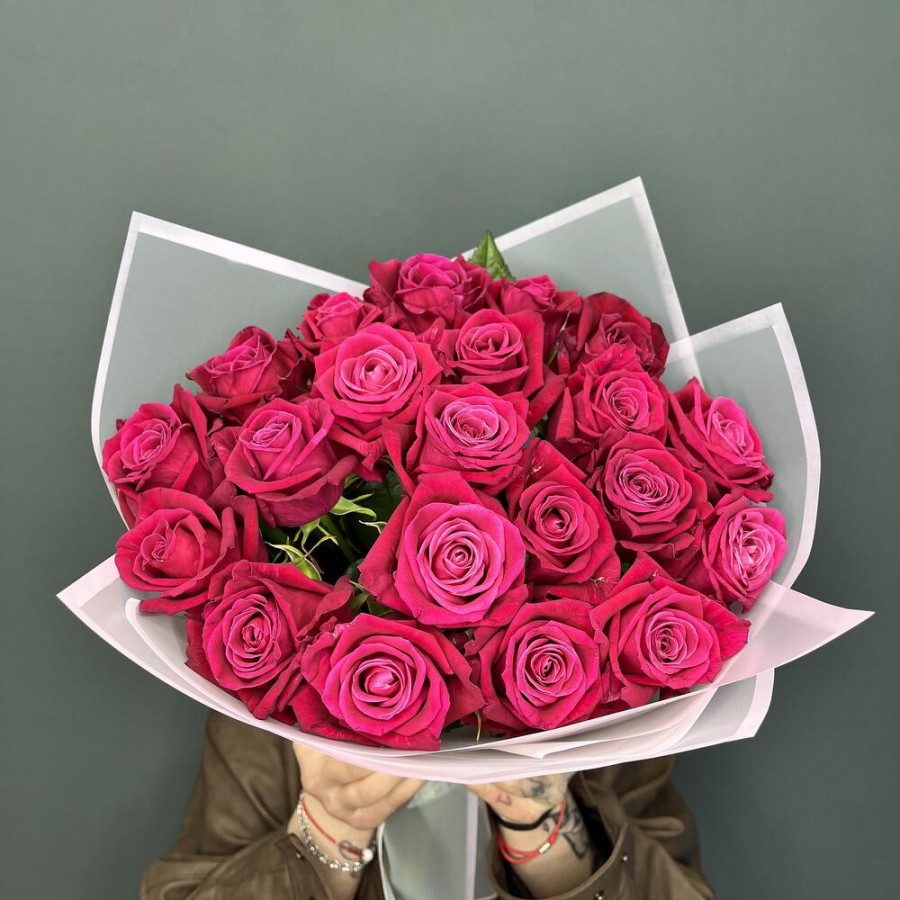 На фото букет из 21 малиновой розы. В составе: роза 21 шт, дизайнерская упаковка 2 шт, атласная лента 1 шт, . Все цветы свежие и ароматные, букет красиво оформлен и отлично подходит для подарка. Доступна доставка цветов или самовывоз.
