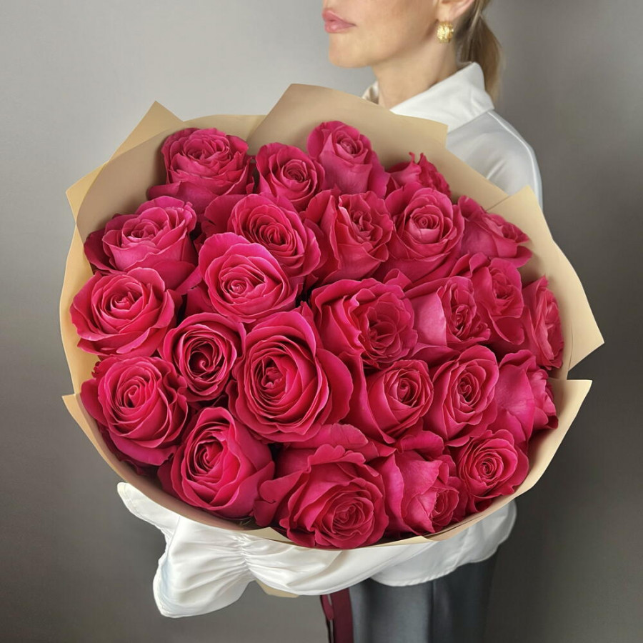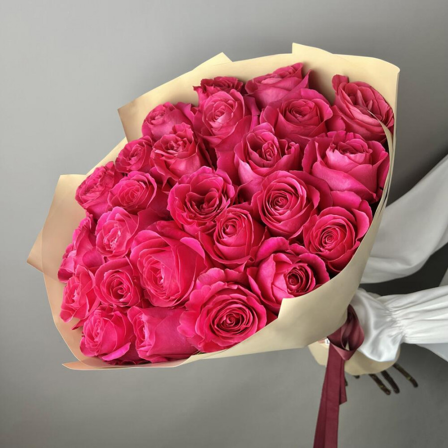 На фото букет из 25 малиновых роз. В составе: роза 25 шт, крафт-бумага 1 шт, атласная лента 1 шт, . Все цветы свежие и ароматные, букет красиво оформлен и отлично подходит для подарка. Доступна доставка цветов или самовывоз.