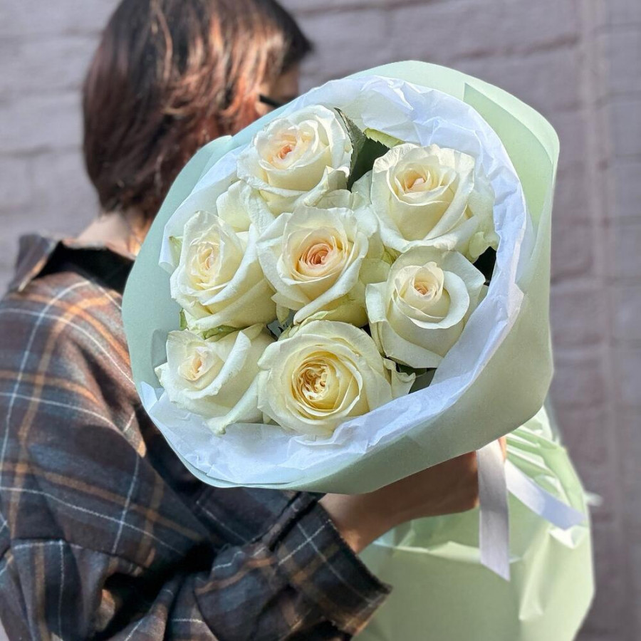 На фото 7 кремовых роз. В составе: роза 7 шт, дизайнерская упаковка 2 шт, атласная лента 1 шт, . Все цветы свежие и ароматные, букет красиво оформлен и отлично подходит для подарка. Доступна доставка цветов или самовывоз.