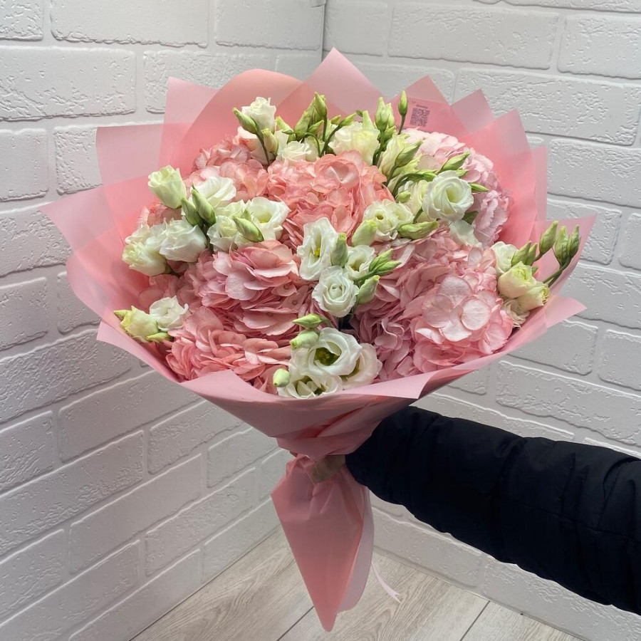 На фото букет из розовых гортензий и белых эустом. В составе: эустома (лизиантус) 7 шт, гортензия 5 шт, дизайнерская упаковка 1 шт, атласная лента 1 шт, . Все цветы свежие и ароматные, букет красиво оформлен и отлично подходит для подарка. Доступна доставка цветов или самовывоз.