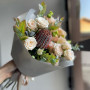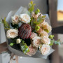 На фото экзотический букет с банксией. В составе: банксия 1 шт, кустовая роза 2 шт, эустома (лизиантус) 2 шт, эвкалипт 1 шт, крафт-бумага 1 шт, . Все цветы свежие и ароматные, букет красиво оформлен и отлично подходит для подарка. Доступна доставка цветов или самовывоз.